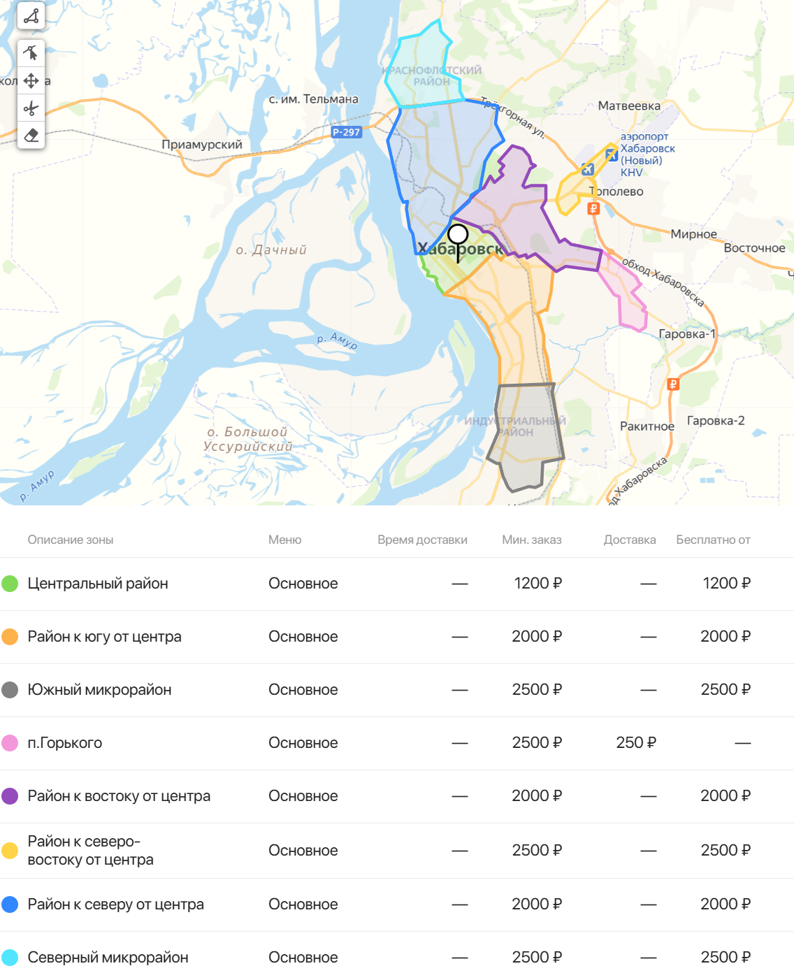 Доставка заказов осуществляется в пределах зон и на условиях, указанных в разделе "Адреса и зоны доставки". ВРЕМЕННО ДОСТАВКА В РАЙОН 2 ХАБАРОВСКА НЕ ОСУЩЕСТВЛЯЕТСЯ! (Приносим свои извинения)
