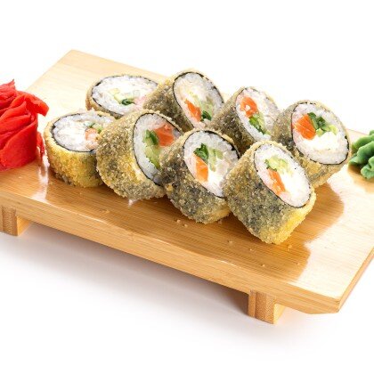 Запеченный ролл. Угорь, спайси соус, огурец, сыр "Пармезан", зелёный лук, рис, нори
