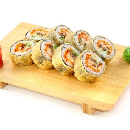 Рис, нори, икра масаго, осьминог, курильский гребешок, тигровая креветка, сливочный сыр, огурец, спайси соус,