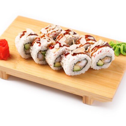Рис, нори, тигровая креветка темпура, трюфельный сыр, огурец, фисташка, острый арахис, микрозелень