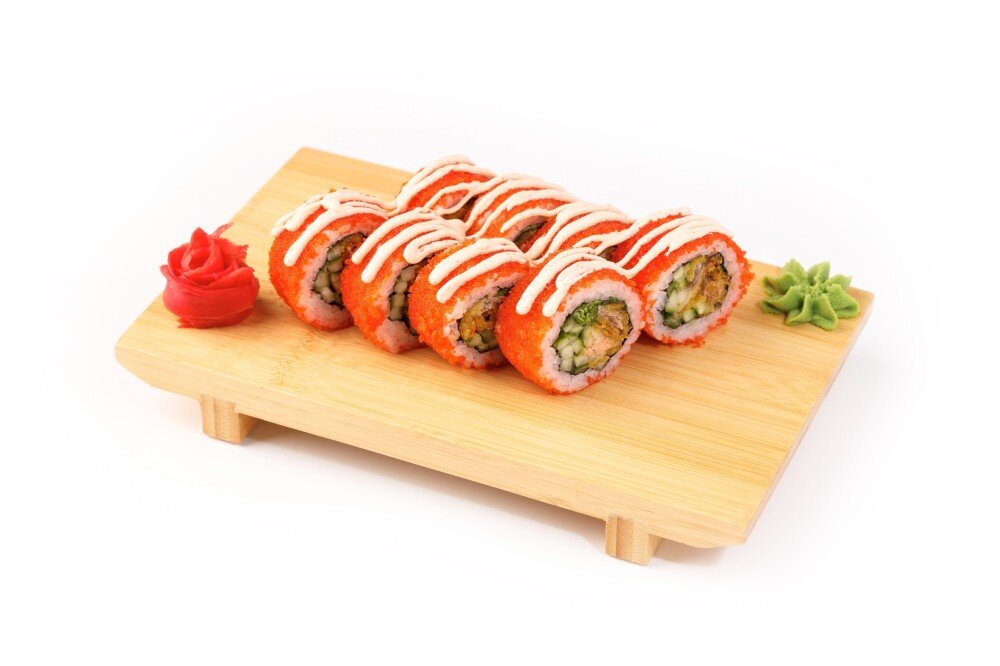 Рис, нори, лосось, лист салата, огурец, икра масаго, спайси соус