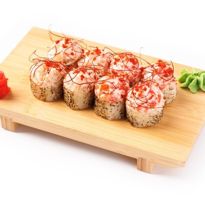 Интересное сочетание двух морепродуктов придётся многим по вкусу. Когда внутри тигровая креветка, а сверху ролл украшает копченый угорь. сладость добавит унаги соус и кунжутное семя