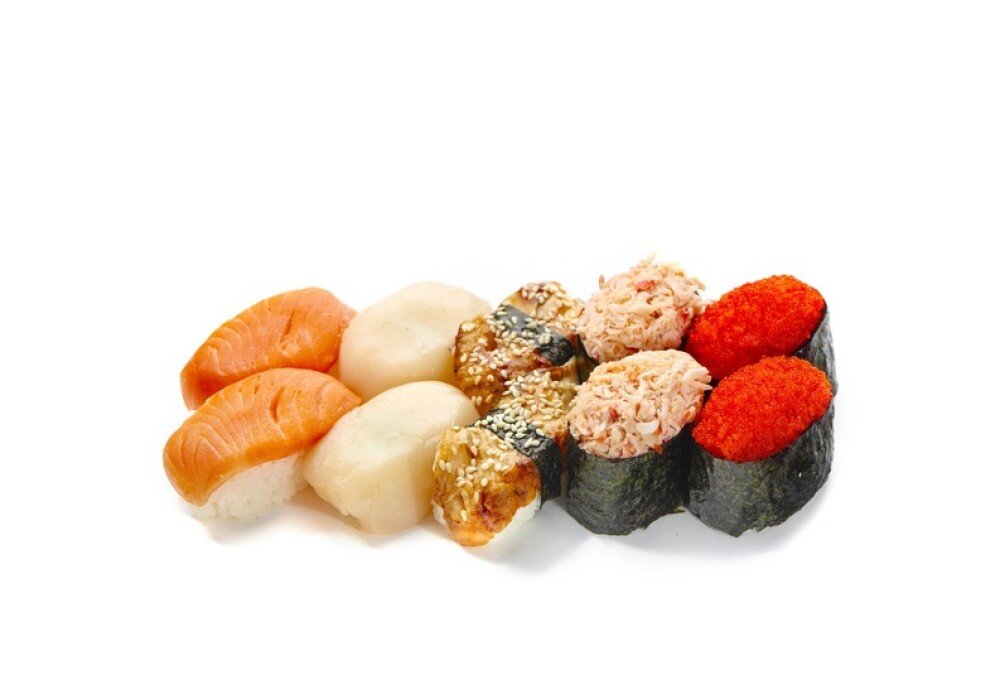 Лосось суши 2шт, Гребешок суши 2шт, Угорь суши 2 шт, Икра масаго 2 шт, Краб суши 2 шт.