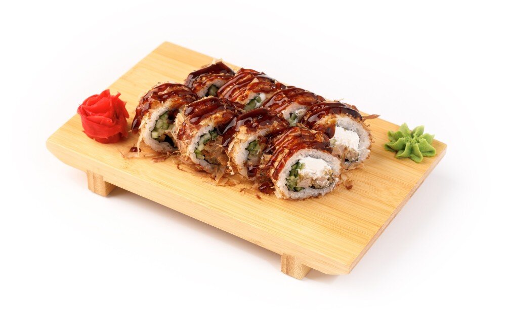 Рис, нори, тунец фри, сливочный сыр, огурец, тунцовая стружка, унаги соус