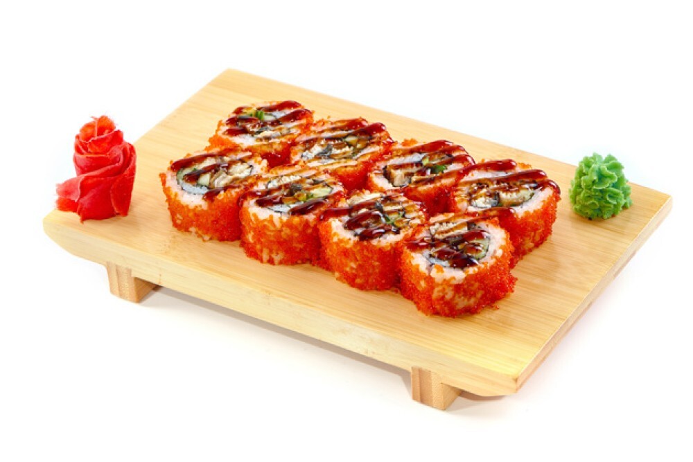 Угорь, огурец, икра масаго, унаги соус, рис, нори
