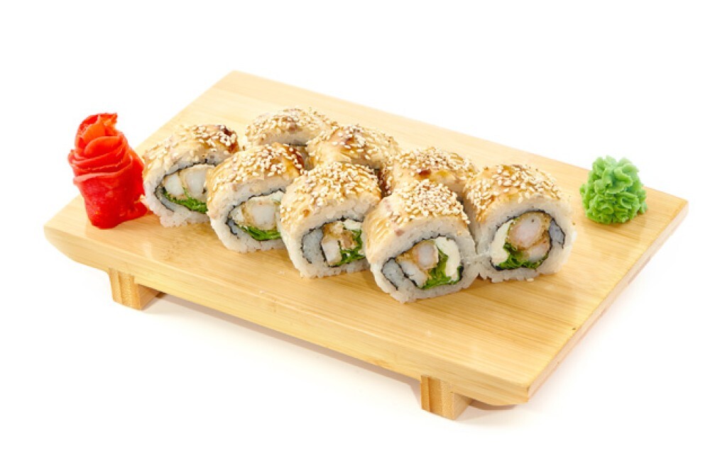 Угорь, тигровая креветка фри, творожный сыр, лист салата, унаги соус, кунжутное семя, рис, нори
