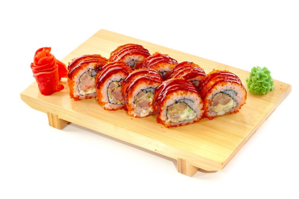 Тунец фри, сырно-медовый соус, огурец, икра масаго, унаги соус, рис, нори