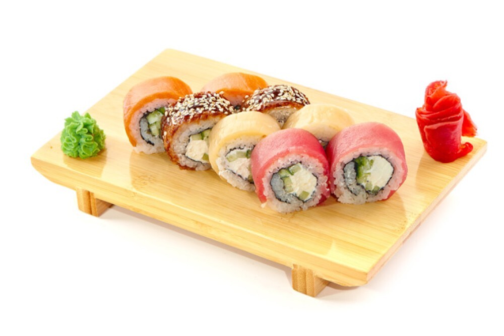 Лосось, гребешок, угорь, тунец, огурец, творожный сыр, унаги соус, кунжутное семя, рис, нори