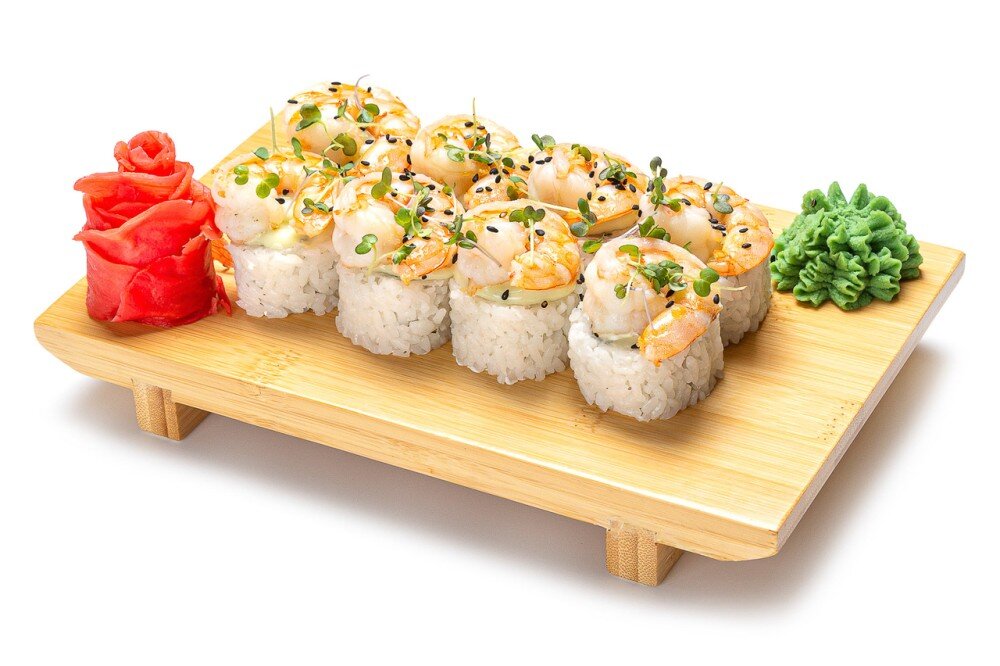 Тигровая креветка, творожный сыр, огурец, соус "Сладкий васаби", кунжутное семя, микрозелень, рис, нори