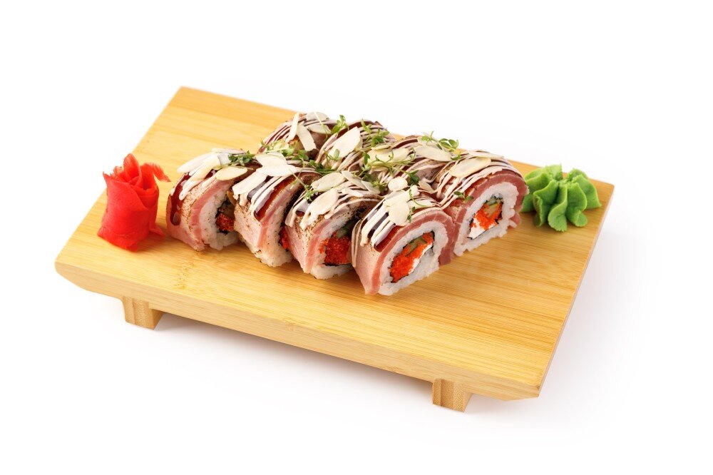 Тунец, опаленный огнём, творожный сыр, огурец, икра масаго, унаги и спайси соус, микрозелень, миндальные лепестки, рис, нори