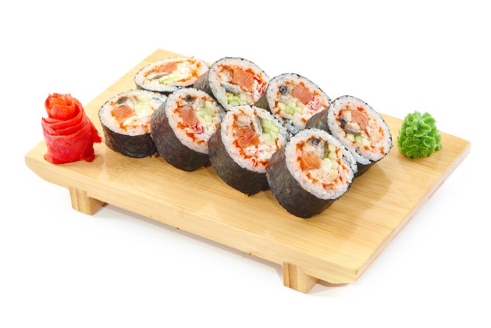 Лосось, угорь, краб, икра масаго, огурец, огурец, рис, нори.