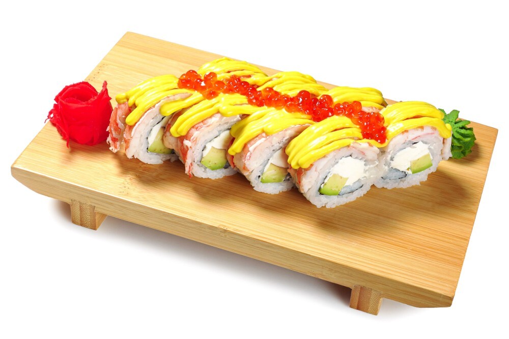 Необычное сочетание вкусов Тигровая креветка, творожный сыр, авокадо, манго соус, лососёвая икра, рис, нори