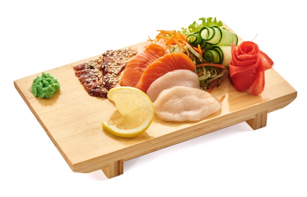 Угорь, лосось, гребешок, морковь, лоба, огурец, лимон, лист салата, унаги соус, кунжутное семя.