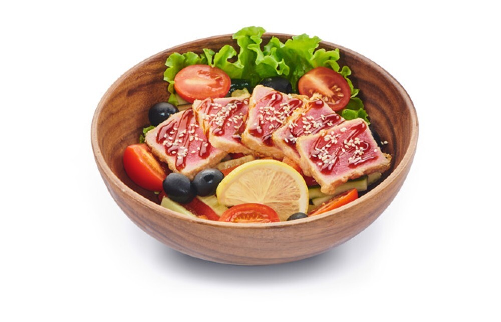 Тунец (прожарки medium rare), помидоры черри, болгарский перец, оливки, лист салата, лимон, унаги соус, кунжутное семя