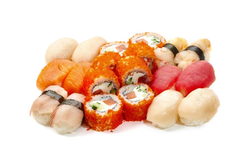 Филадельфия ролл и 12 суши (гребешок суши 2 шт, лосось суши 2 шт, палтус 2 шт, тунец суши 2 шт, тигровая креветка суши 2 шт, осьминог суши 2 шт.)