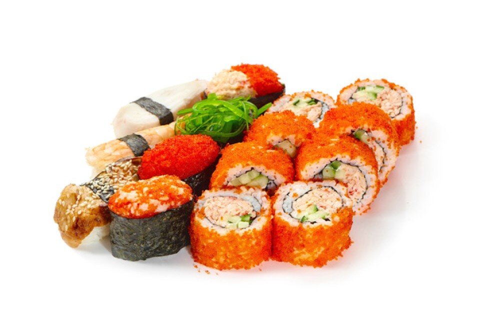 Калифорния краб и 7 суши ( осьминог, угорь, креветка тигровая, чукка, креветка масаго, кани масаго, икра масаго)