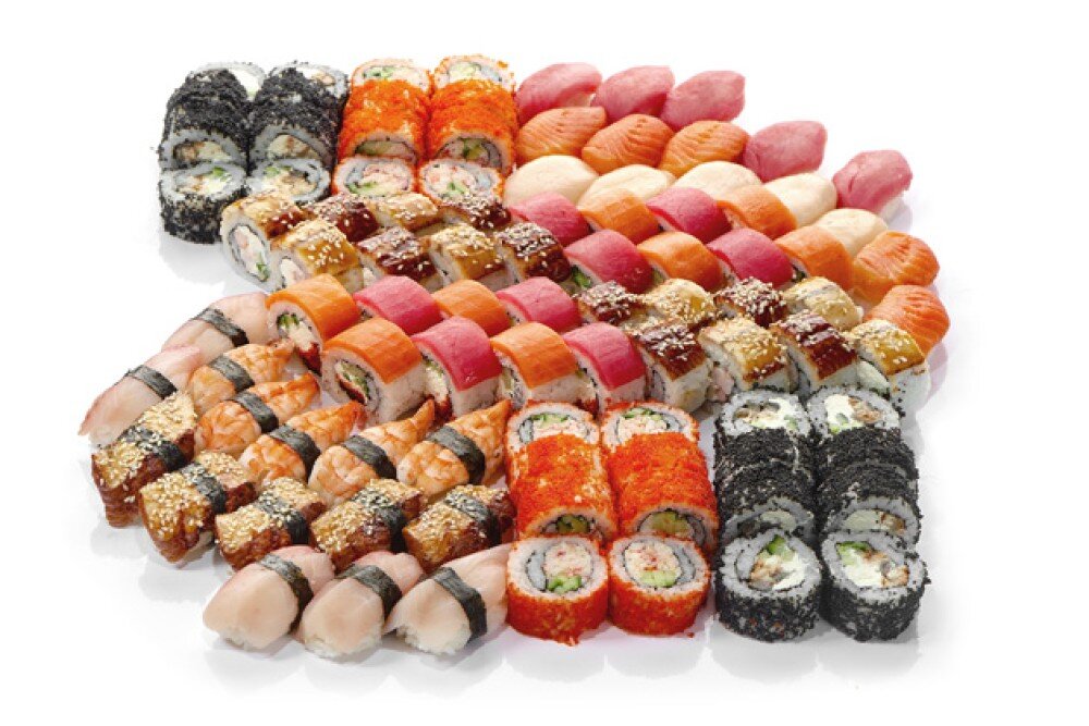 Роллы по 2шт: Калифорния, Вашингтон, Филадельфия Люкс, Эби Фрай. Суши по 5 шт: лосось, гребешок, угорь, тунец, палтус, креветка тигровая
