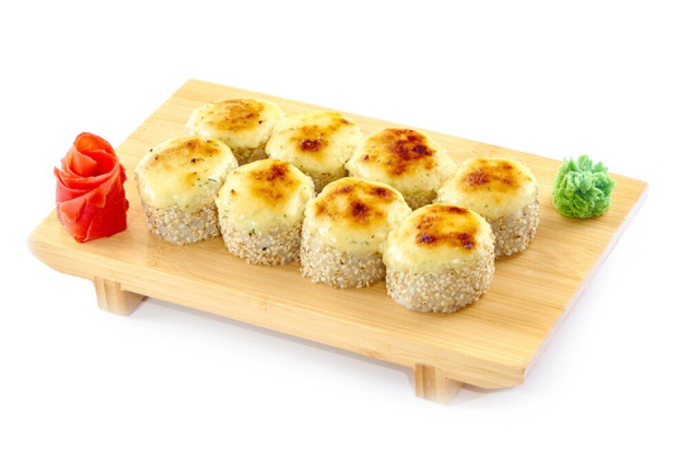 Запеченный ролл Краб, творожный сыр, огурец, фирменный сырно-медовый соус, кунжутное семя, рис, нори