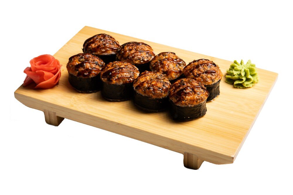 Запеченный ролл. Креветка, творожный сыр, огурец, угорь (мелко рубленный), икра масаго, творожный сыр, унаги соус