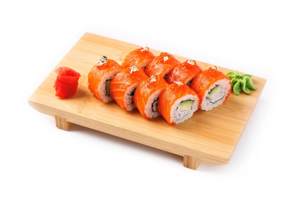 Рис, нори, лосось, огурец, трюфельный сыр, лососёвая икра, пищевое золото