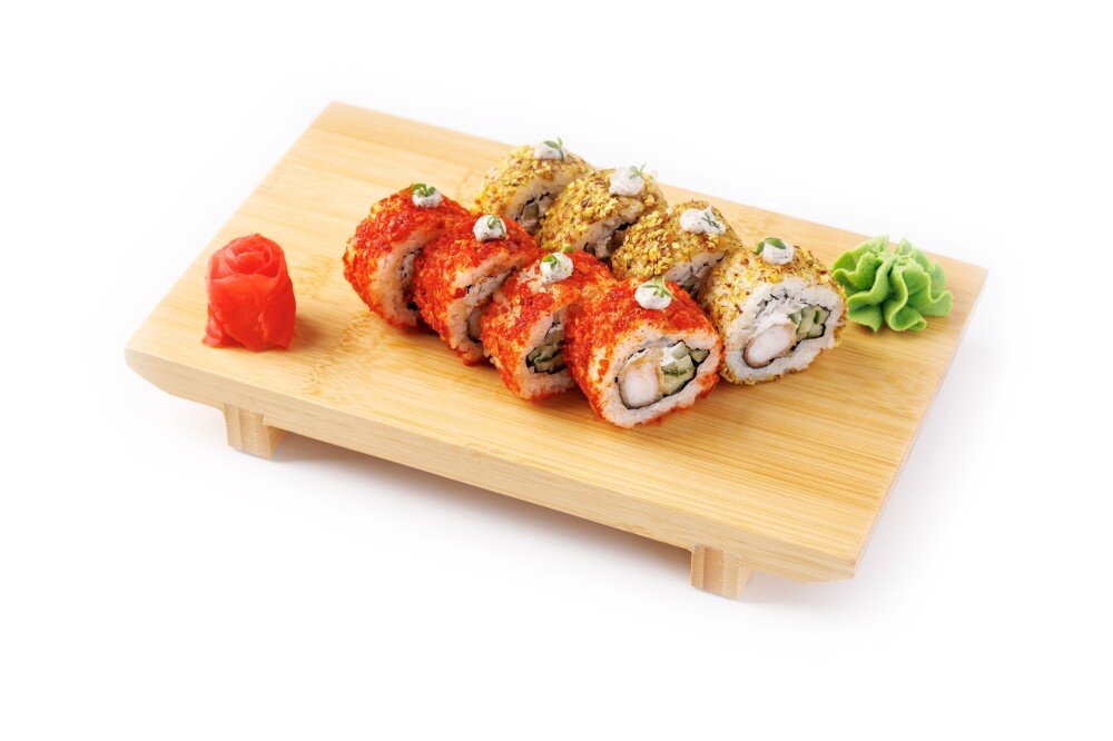 Рис, нори, тигровая креветка фри, трюфельный сыр, огурец, фисташка, острый арахис, майонез, микрозелень