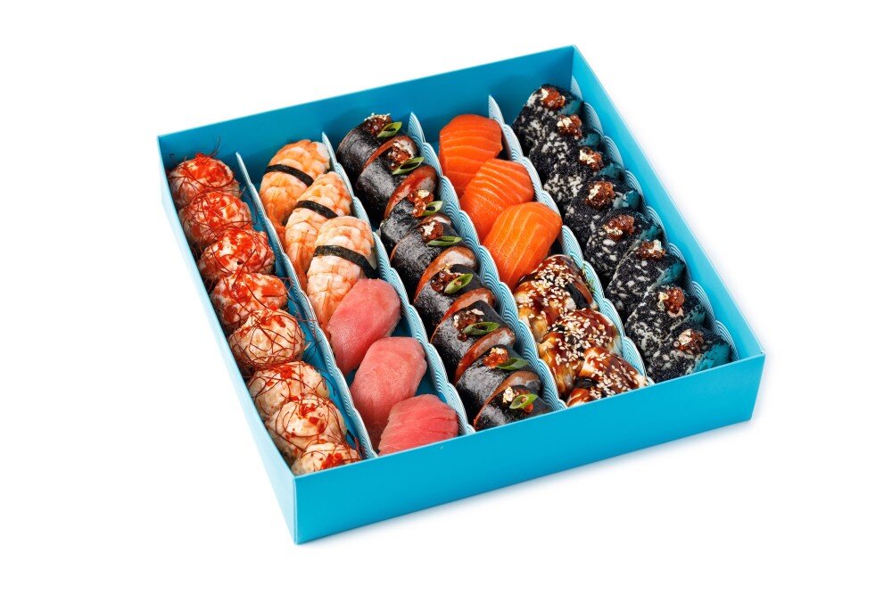 Красный Фудзи, Бостон, Сахалинский с золотом роллы, Тунец суши 3 шт., Лосось суши 3 шт., Тигровая креветка суши 3 шт., Угорь суши 3 шт.