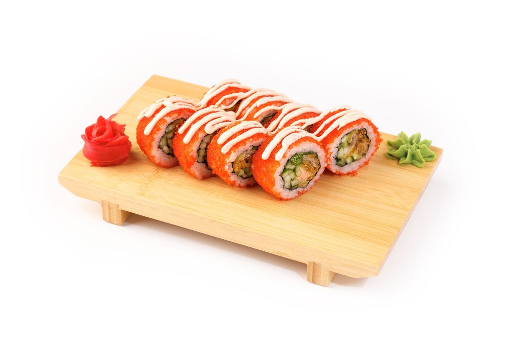 Лосось фри, огурец, лист салата, масаго, спайс соус, рис, нори